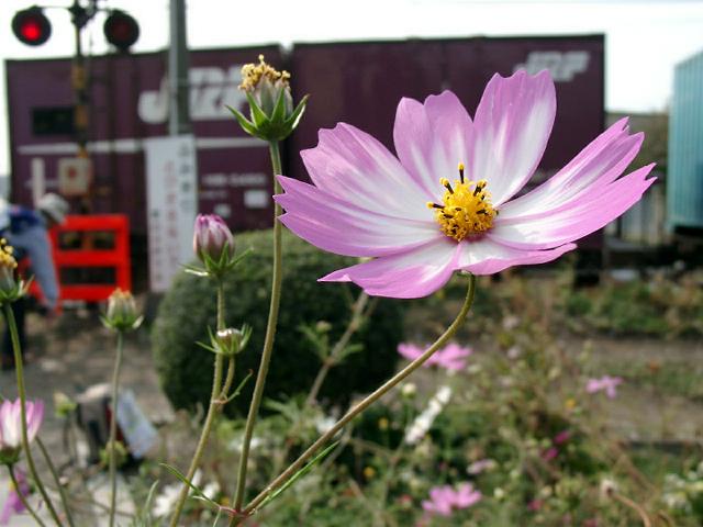 河川敷のマラソンコース 踏み切り端のコスモス 休憩所にて記念撮影